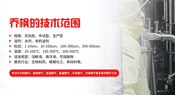 上海喬楓實(shí)業(yè)有限公司,成立于2012年,是從事噴霧干燥設(shè)備的研發(fā)設(shè)計(jì)、生產(chǎn)、銷售(小型噴霧干燥機(jī)實(shí)驗(yàn)型噴霧干燥機(jī)35℃低溫噴霧干燥機(jī)有機(jī)溶劑噴霧干燥機(jī)低溫閉式循環(huán)噴霧干燥機(jī)超細(xì)粉末噴霧干燥機(jī)噴霧冷凍干燥機(jī)真空噴霧干燥機(jī)氣流噴霧干燥機(jī)噴霧造粒干燥機(jī)離心噴霧干燥機(jī)沸騰制粒機(jī)等)和售后于一體的綜合性公司,本公司現(xiàn)成為一家致力于為生物制藥、精細(xì)化工、新能源、陶瓷造粒及食品工程等領(lǐng)域提供全套解決方案的整線交鑰匙工程企業(yè)。